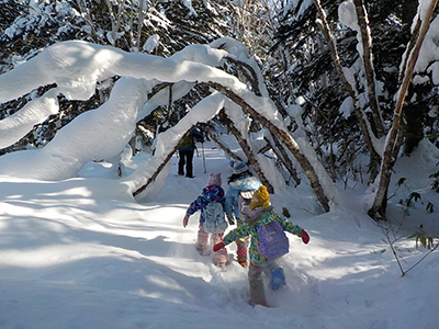 今回はスノーシュー(西洋かんじき)を履いて、森の中の探検に出発です。初めて付けるスノーシューにみんなドキドキ。履いた後も歩きがとってもゆっくりでぎこちなく、慣れるまでにとまどっていたようです。